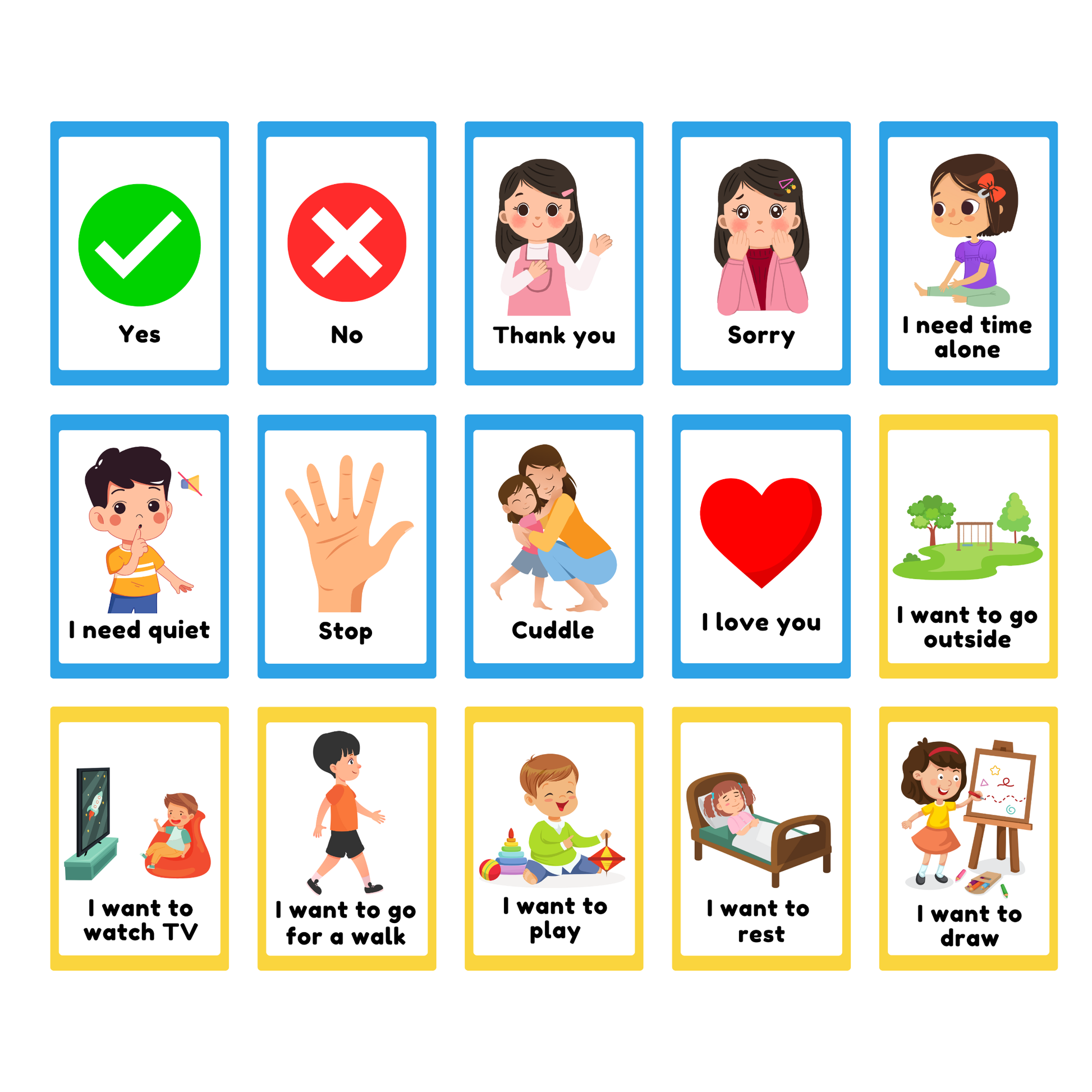 These cards typically feature images, symbols, or words that represent common situations, feelings, or requests. By pointing to or handing over the appropriate card, individuals with autism can communicate their desires or concerns without relying solely on verbal language, which can be challenging for some.