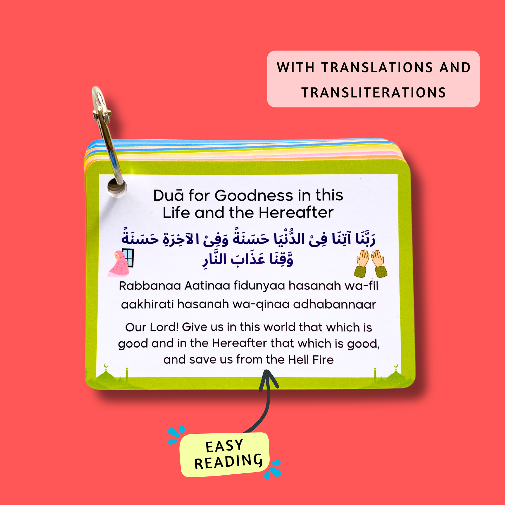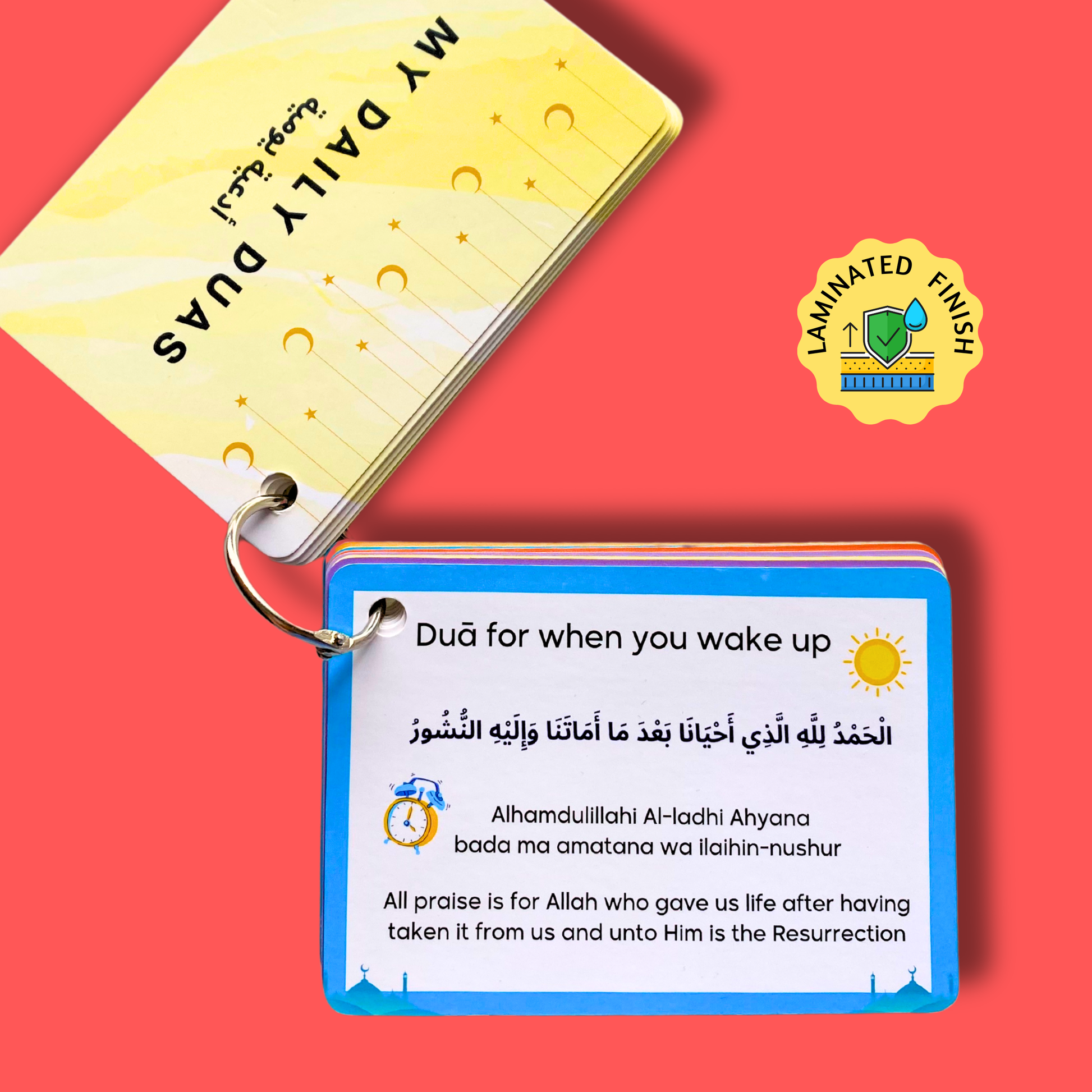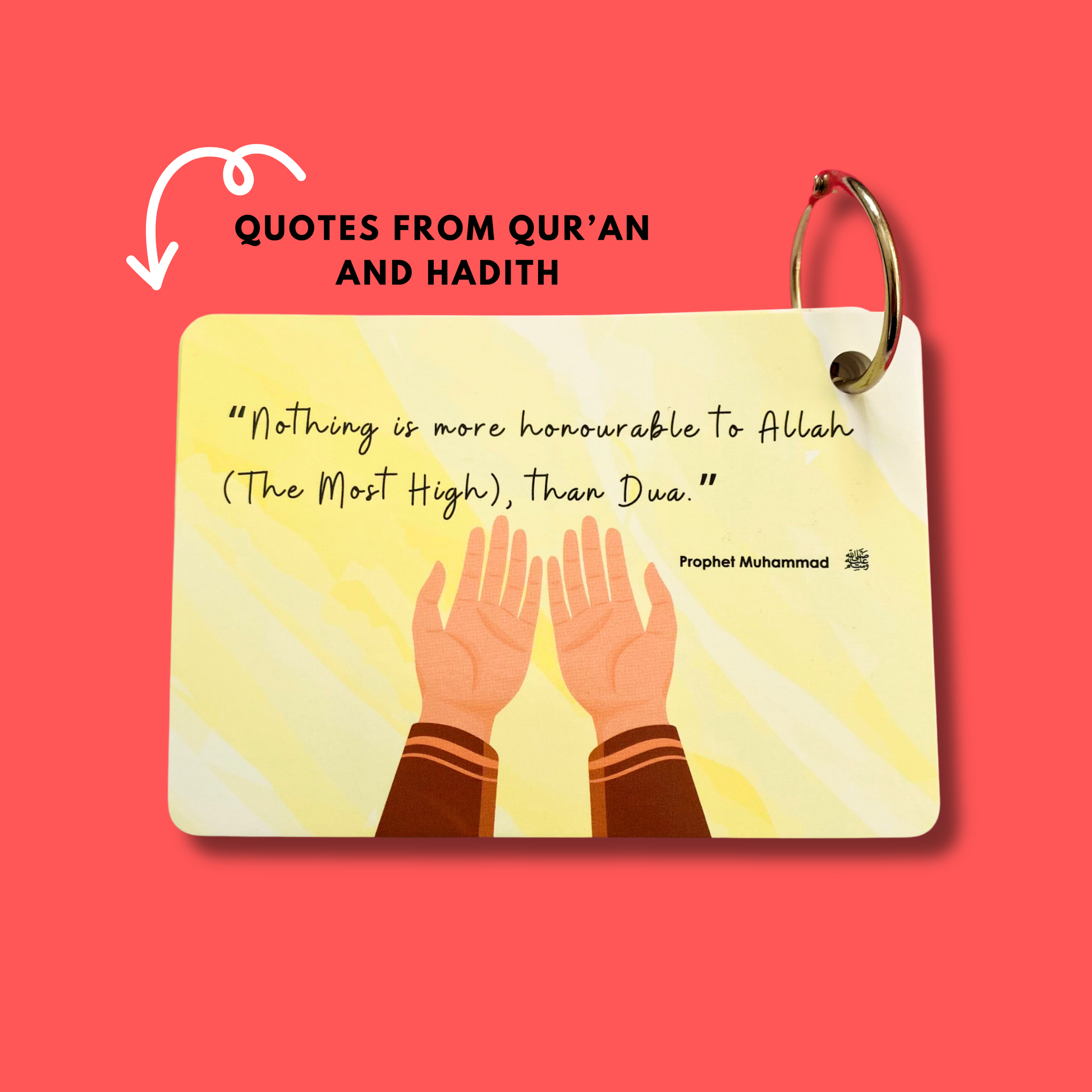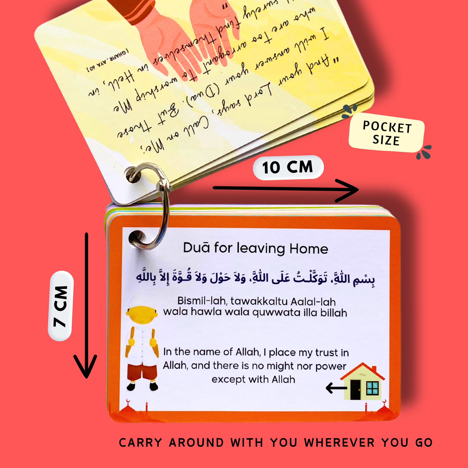 This Daily Dua Flash Card set has been designed as a carry around remembrance to the daily Duas all Muslims must know and recite. It is a perfect essential for Muslims of all ages to learn and improve memory of the Duas. It can be easily accessible and be carried around with you wherever you go. It can be a great, unique gift to friends and beloved ones. It includes 20 Dua Cards on the front, and Quotes from Hadith and Qur'an on the back of each card. It comes held in a binding ring for personal safe keeping. The cards are laminated, professional quality and made to last!